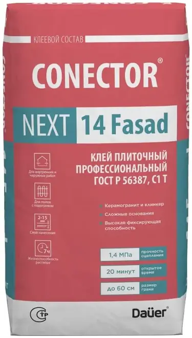 Компания реализует плиточный клей профессиональный Dauer Conector Next 14 Fasad (25 кг) оптом и поштучно. Скидки для постоянных клиентов. Дауэр - описание и технические характеристики.