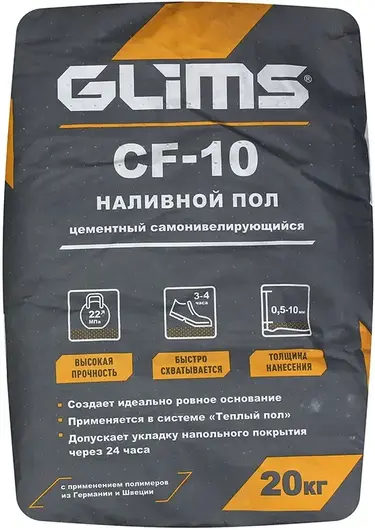 В течение 2 дней с начала проведения работ необходимо избегать сквозняков и резкого перепада температуры воздуха. Проводить дальнейшие работы можно только после полного высыхания пола. Деформационные швы в помещениях площадью менее 6*6 м² нарезать не обязательно, на больших площадях деформационные швы нарезаются картами не более 6*6 м² . Наливной пол Glims CF-10 рекомендован для использования в системе " теплый пол" в качестве финишного слоя (подготовка основания, приготовление раствора, технология производства работ не меняются). При работе необходимо соблюдать нормы СНиП и производственной гигиены.