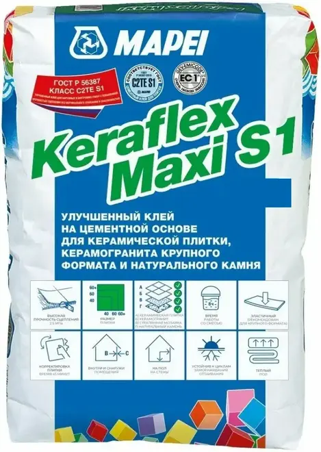 Для укладки керамической плитки, тяжелых и крупноформатных плит, керамогранита и натурального камня без сползания и с увеличенным открытым временем класса C2TE S1.