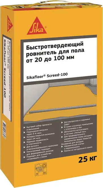 Вылейте приготовленный раствор (Sikafloor-206 Screed + вода + SikaLatex) на подготовленную и увлажненную поверхность и равномерно распределите с требуемым расходом с помощью кельмы, шпателя, маховой кисти или другого подходящего инструмента. Нанесение Sikafloor-206 Screed на адгезионный слой производить метод “мокрый по мокрому”, в течение 20-30 минут, пока адгезионный раствор свежий и не начал твердеть. Выравнивающая стяжка: Установите направляющие маяки и укрепите их по всей длине. Для этих целей можно использовать раствор Sikafloor-206 Screed. Готовый к работе раствор для стяжки равномерно распределить по поверхности основания и разровнять по маякам при помощи правила. Для создания более качественной поверхности стяжку рекомендуется загладить металлической или пластиковой теркой. При наличии в бетонном основании деформационных швов их необходимо повторить в выравнивающей стяжке. Материал наносят на поверхность выравнивающей стяжки кистью, валиком или распылителем, как только выравнивающая стяжка наберет прочность для пешеходного движения. Свежеуложенную стяжку следует защитить от намокания и другого воздействия влаги, конденсата, сквозняков, прямых солнечных лучей как минимум на 2-4 дня. Во время укладки, а также в течение 3-5 дней после нанесения не используйте принудительное проветривание или отопительное оборудование для сушки пола. Не превышайте рекомендованное количество воды.